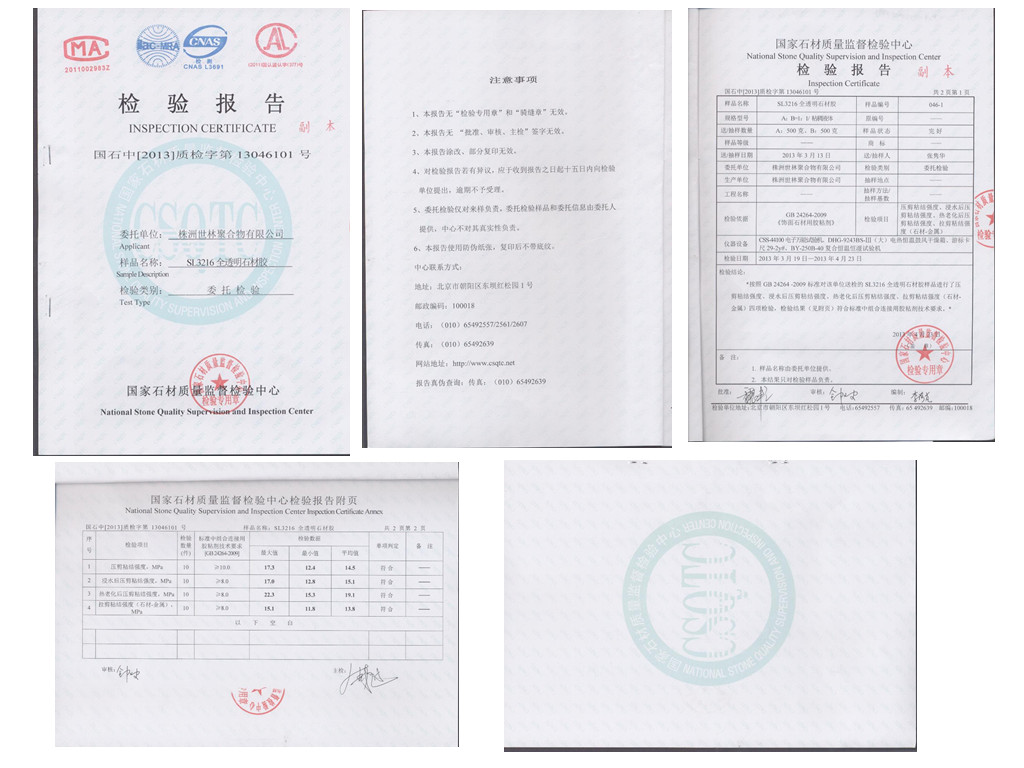 世林膠業(yè)SL3216透明石材膠送國家石材質(zhì)量監(jiān)督檢驗(yàn)中心檢驗(yàn)合格