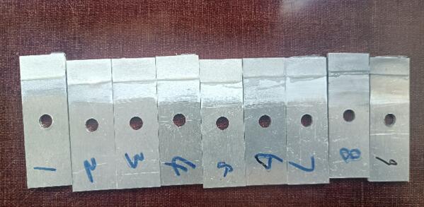 我們選取的砂布目數為:60、120、180、320、600、800、1200、1500、2000。我們分別按1-9給這個試片進行排序。1代表60目,2代表120目...,我們能從打磨痕跡看出,號數越大的,打磨越細膩,1500和2000目砂紙打磨的硬鋁試片基本能呈現出鏡面光澤。(下面的圖片拍攝可能是反光問題,不能看出差異,實物實際是很能看出來區(qū)別的,不信你試試,哈哈)